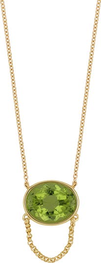 A bezel-set round peridot brings luxurious sparkle to a pendant necklace handcrafted from warm 14-karat yellow gold.