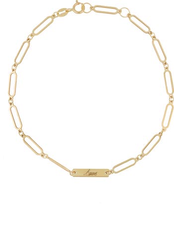 An etched 'love' station brings romantic shine to this layerable paper clip–chain bracelet handcrafted in Italy from warm 14-karat yellow gold.