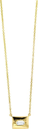 A baguette-cut diamond sparkles from a polished rectangular frame on this dainty pendant necklace handcrafted from warm 18-karat yellow gold.