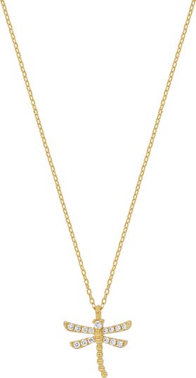 Prong-set round diamonds bring luxurious sparkle to this whimsical dragonfly pendant necklace handcrafted from warm 18-karat yellow gold.
