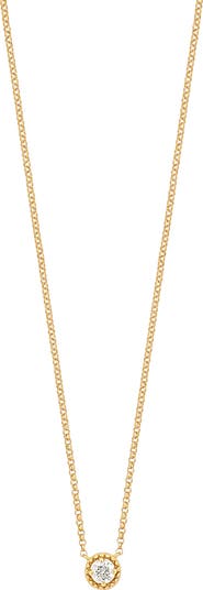 A prong-set round diamond framed by a milgrain halo brings luxurious sparkle to this dainty pendant necklace handcrafted from warm 18-karat yellow gold.