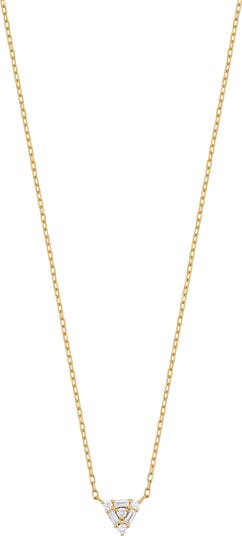 Prong-set round- and baguette-cut diamonds bring luxurious sparkle to this dainty triangle pendant necklace handcrafted from warm 18-karat yellow gold.