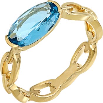 An oval-cut blue topaz brings sparkling color to a welded chain-link ring handcrafted from warm 18-karat yellow gold.