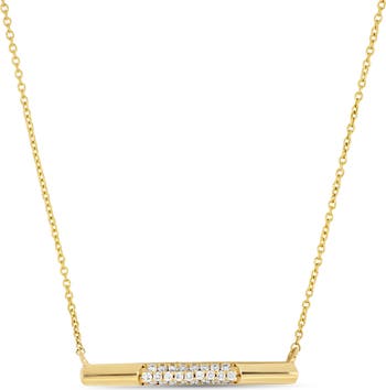 A slender bar pendant adorned with bright-white diamonds is centered on a delicate chain necklace handcrafted from 18-karat gold.