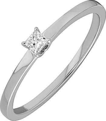 A slender stacking ring handcrafted from icy 18-karat gold is centered by a singular diamond to bring understated shine to elevated ensembles.