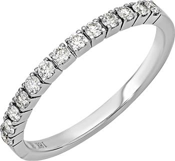 A row of thirteen bright-white diamonds deliver delightful sparkle to a slim, stackable ring handcrafted from icy 18-karat gold.