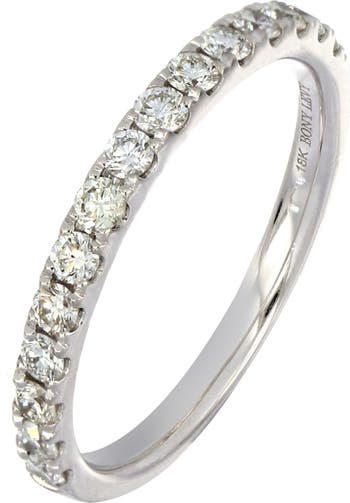 Pavé diamonds lend elegant sparkle to a delicately slim, stackable band handcrafted from shiny 18-karat gold.