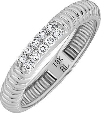 Two rows of dazzling diamonds lend elegant sparkle to a wide band ring covered in a ribbed texture and handcrafted from 18-karat gold.
