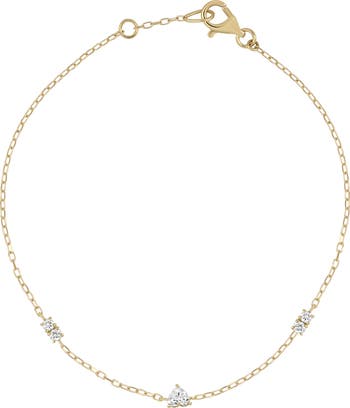Bright-white diamond stations give a sparkling flourish to the delicate chain of this 18-karat gold bracelet that gives warmth to your wrist.