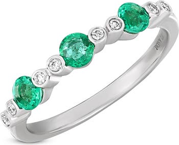 Bright-white diamonds are interspersed between emeralds atop a slim, stackable ring handcrafted from 18-karat gold.
