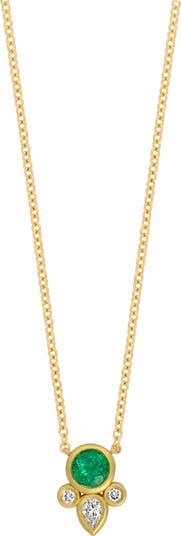 A single round emerald enriches a handcrafted pendant anchored by twinkling diamonds and set on a delicate chain of 18-karat gold.