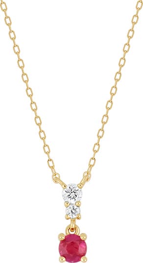 A round-cut ruby is framed by a duo of prong-set diamonds to offer rich color and eye-catching sparkle on this delicate necklace handcrafted from 18-karat gold.