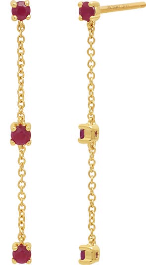 Add a delicate sparkle to your lobes with these dainty linear earrings in 18-karat gold each housing a vibrant trio of rubies.