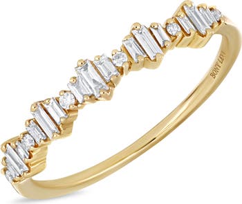 A combination of baguette- and round-cut diamonds bring Art Deco appeal to a slim, stackable ring handcrafted from warm 18-karat gold.