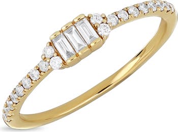 A combination of baguette- and round-cut diamonds lend luxurious shimmer and shine to a slim stacking ring handcrafted from warm 18-karat gold.