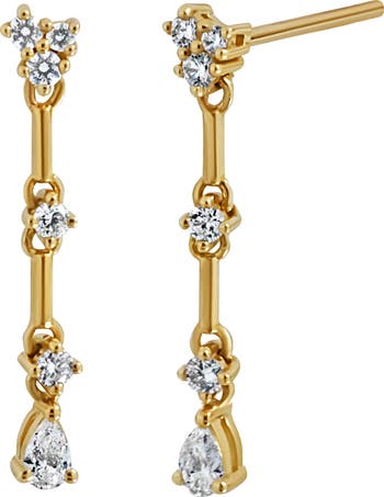 Round and pear-cut diamonds bring luxurious sparkle to dainty linear drop earrings handcrafted from polished 18-karat yellow gold.