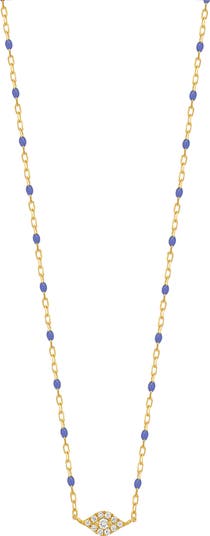 Sparkly pavé diamonds illuminate a dainty evil-eye pendant on this enamel-dotted necklace handcrafted from warm 18-karat yellow gold.
