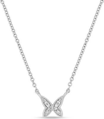 Prong-set round diamonds bring luxurious sparkle to this dainty butterfly pendant necklace handcrafted from polished 18-karat white gold.