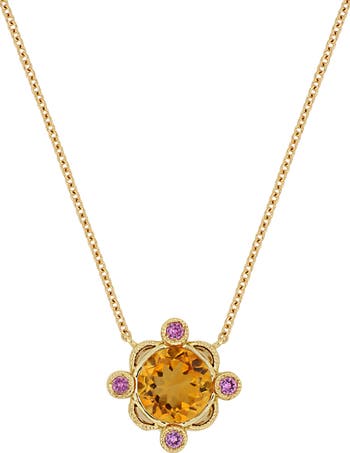 A vibrant citrine stone, set in a sleek bezel, adds instant glamour to this pendant necklace crafted from gleaming 18-karat gold. Four pink sapphires adorn the sides for added sparkle.