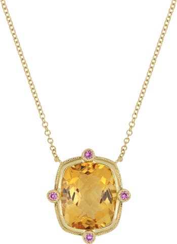 A vibrant citrine stone, set in a sleek bezel, adds instant glamour to this pendant necklace crafted from gleaming 18-karat gold. Four pink sapphires adorn the sides for added sparkle.