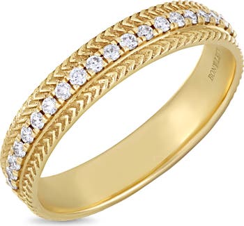 A chevron texture frames the row of round-cut diamonds down the center of a wide band ring handcrafted from warm 18-karat gold.