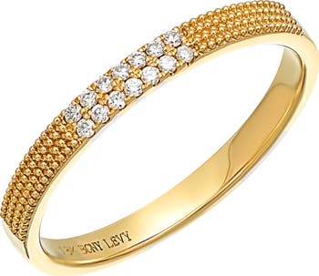 A bubbly texture enriches the band of a handcrafted 18-karat-gold ring illuminated by round-cut diamonds.