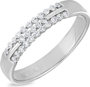 Three rows of bright-white diamonds illuminate a stackable band ring handcrafted from icy 18-karat gold.