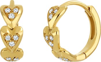 Sparkly round diamonds center polished heart motifs on these romantic huggie-hoop earrings handcrafted from warm 18-karat yellow gold.