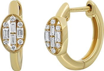Three rows of bright-white diamonds lend sophisticated shimmer to handcrafted 18-karat-gold earrings designed to modernize your hoops collection.