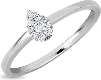 A cluster of diamonds define the teardrop shape perched on a delicate, stackable ring handcrafted from 18-karat white gold.