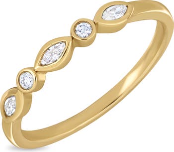 Bezel-set round- and marquise-cut diamonds bring luxurious sparkle to this dainty stackable ring handcrafted from warm 18-karat yellow gold.