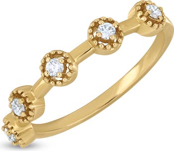 Milgrain halos frame five prong-set round diamonds on this dainty stackable ring handcrafted from warm 18-karat yellow gold.