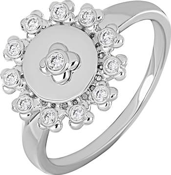 A total of 12 bezel-set diamonds illuminate the floral motif of this handcrafted 18-karat white-gold ring.