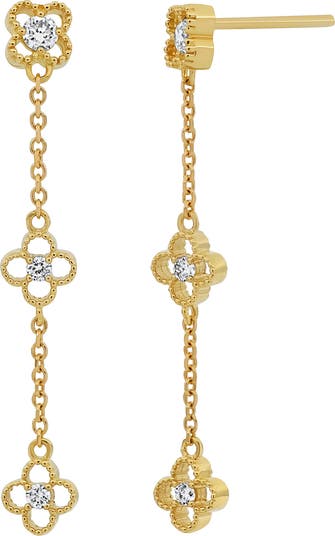 Prong-set round diamonds center open-clover motifs on these dainty linear earrings handcrafted from warm 18-karat yellow gold.
