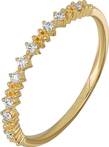 Prong-set diamonds sparkle along the smooth band on this 18-karat gold ring creating a striking addition to your daily stack.