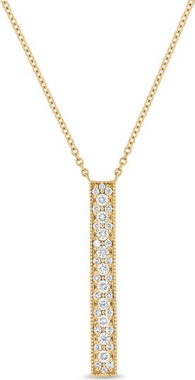 Pretty bright-white diamonds add elegant sparkle to a slim bar pendant suspended from a delicate chain necklace handcrafted from 18-karat gold.
