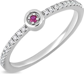 A four-prong ruby lends subtle color to this stackable ring crafted from polished 18-karat white gold and inset with white diamonds.
