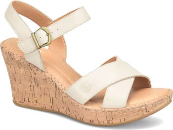 A cork-wrapped wedge heel elevates a sandal that's topped with crisscrossing leather straps.