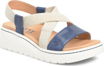 Crisscrossing instep straps create modern dimension on a weekend-ready sandal set on a cushioned footbed and chunky wedge heel.