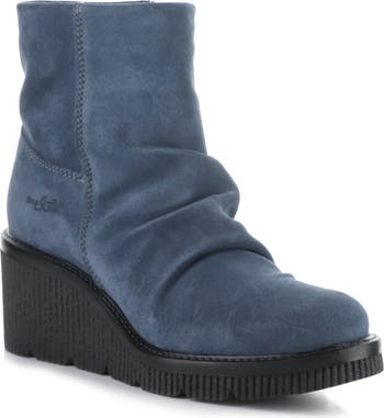 A waterproof design and ruched upper distinguish a cushioned bootie lifted by a subtle platform and integrated wedge heel.