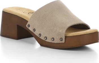 Antique nailhead studs trim the midsole of a weekend-ready slide sandal rendered in supple suede and lifted by a woodgrain platform and block heel. A softly lined footbed with built-in cushioned adds enhanced comfort.