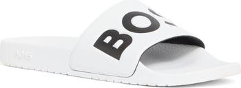 Bold branding tops off a laid-back Italian slider featuring a contoured footbed for a customized fit.