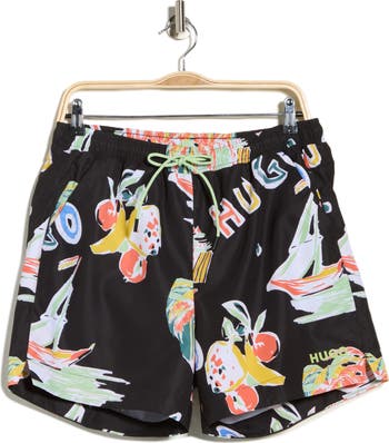 Tropical motifs sweep across on these swim trunks made of quick-drying fibers with handy pockets for on-land essentials.