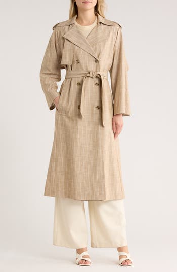 Tonal stripes add interest to this classic double-breasted trench topped with wide, face-framing lapels.