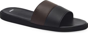 Neutral tones and subtle branding lend heritage appeal to the sturdy vamp strap atop a casual slide set on a lightly cushioned footbed.