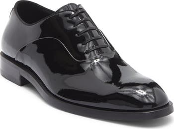 A plain toe adds versatile appeal to a classic oxford made in Italy of supple leather with a sleek patent finish.