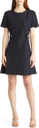 Glossy buttons at the waist embolden this desk-to-dinner dress designed in a fit-and-flare silhouette.