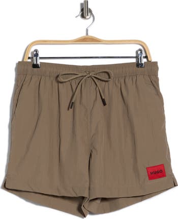 A bright-red logo patch brands the left pant of these quick-drying swim trunks styled with handy pockets.