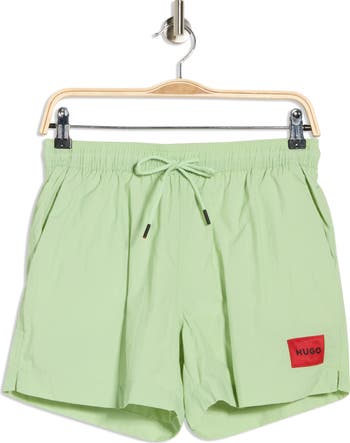 A bright-red logo patch brands the left pant of these quick-drying swim trunks styled with handy pockets.