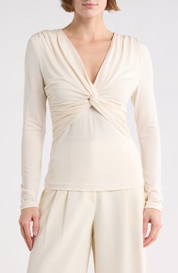 A deeply dipped neckline leads way to the shaping front twist on this stretch-hinted top framed by long sleeves.